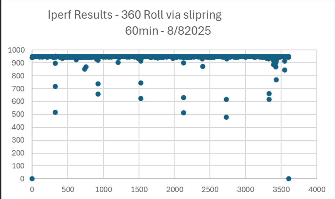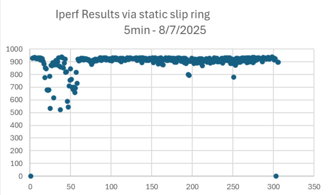 - No slip rings at all – straight cable → should be a flat line at ~940 Mb/s.