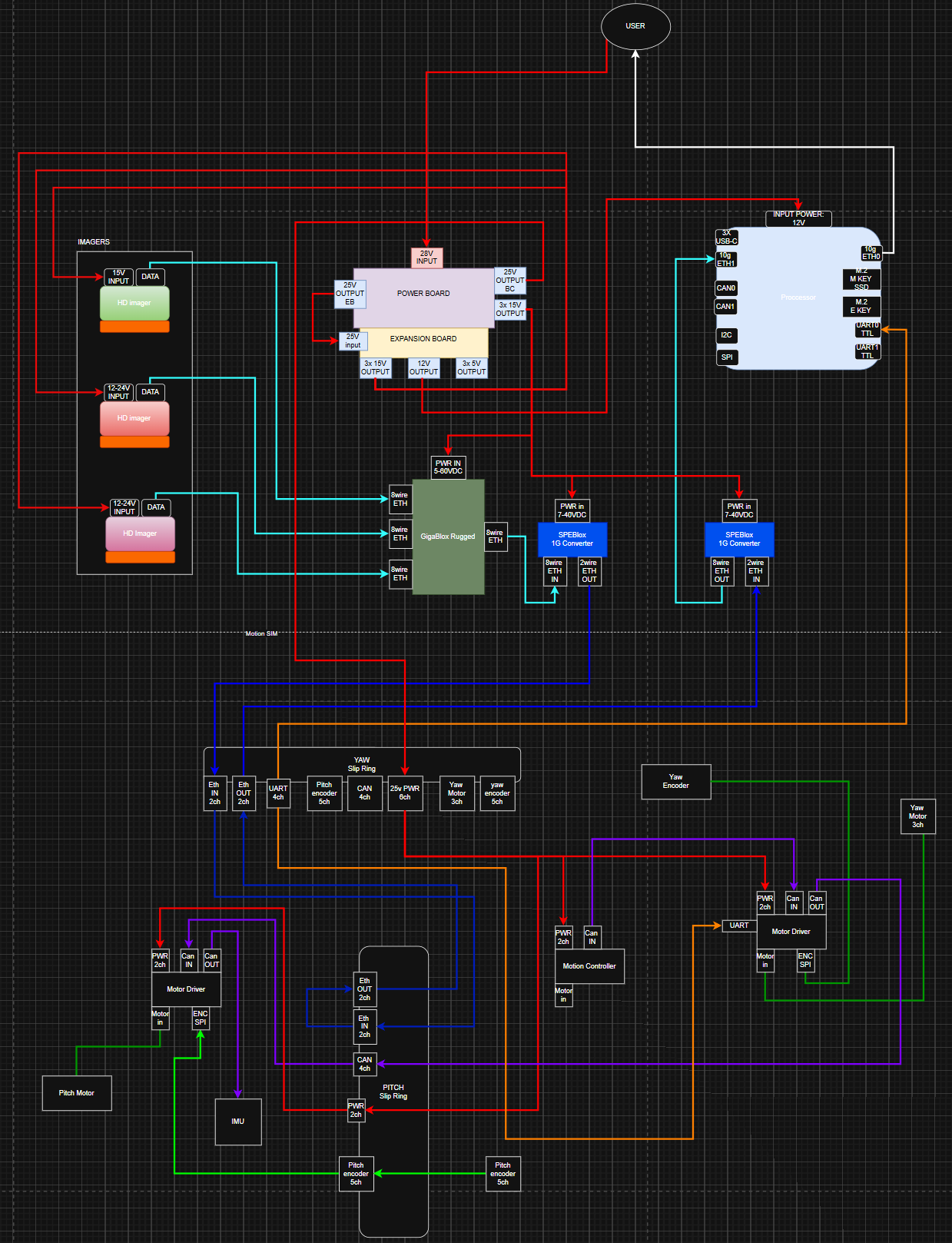 In this development architecture, imager are placed outside of the motion sim with SPE and power flowing through the pitch and yaw slip rings(GbE Rated) then back out to the user. We are doing this in order to stress the SPE and other signals over the sliprings.